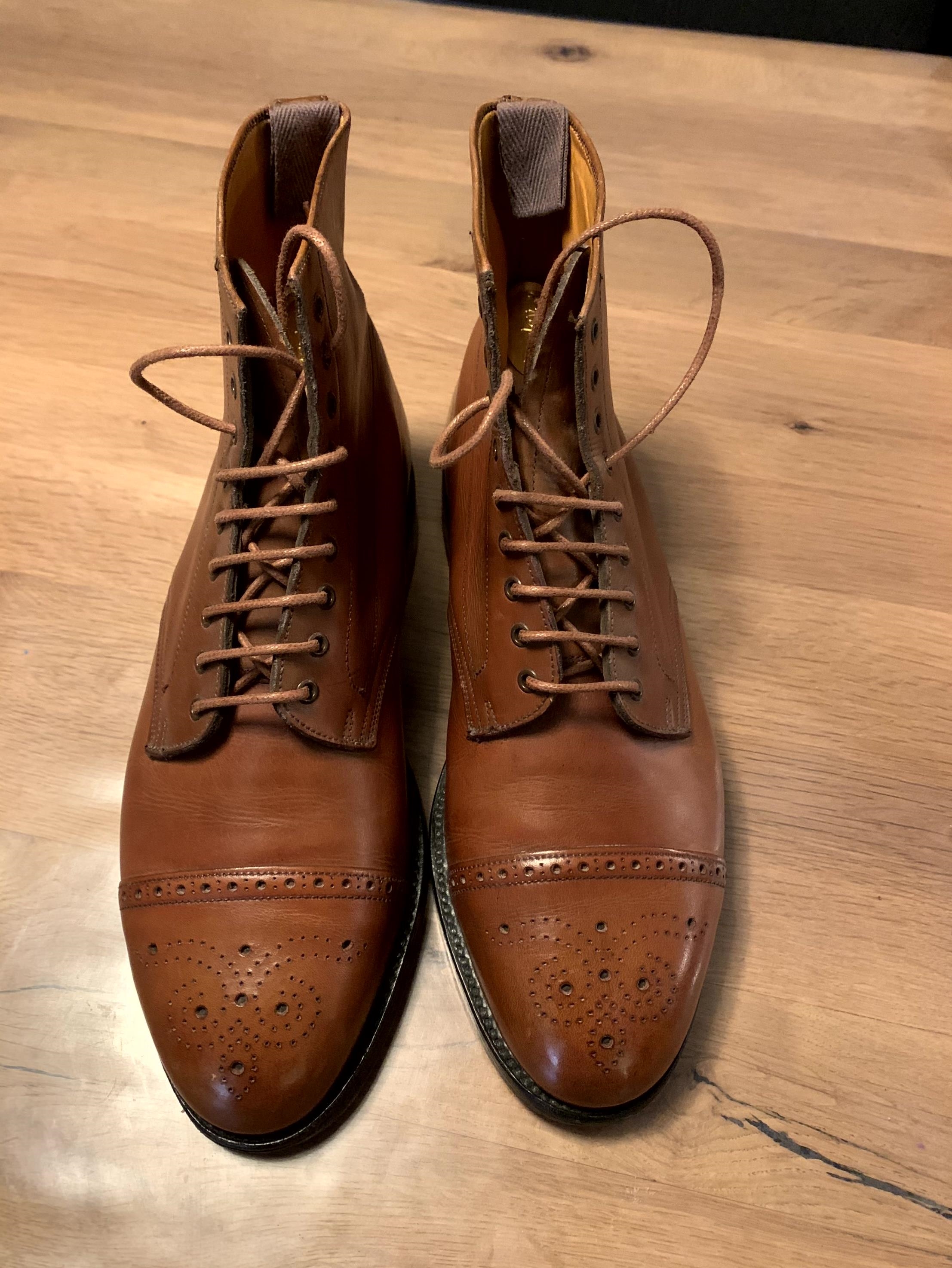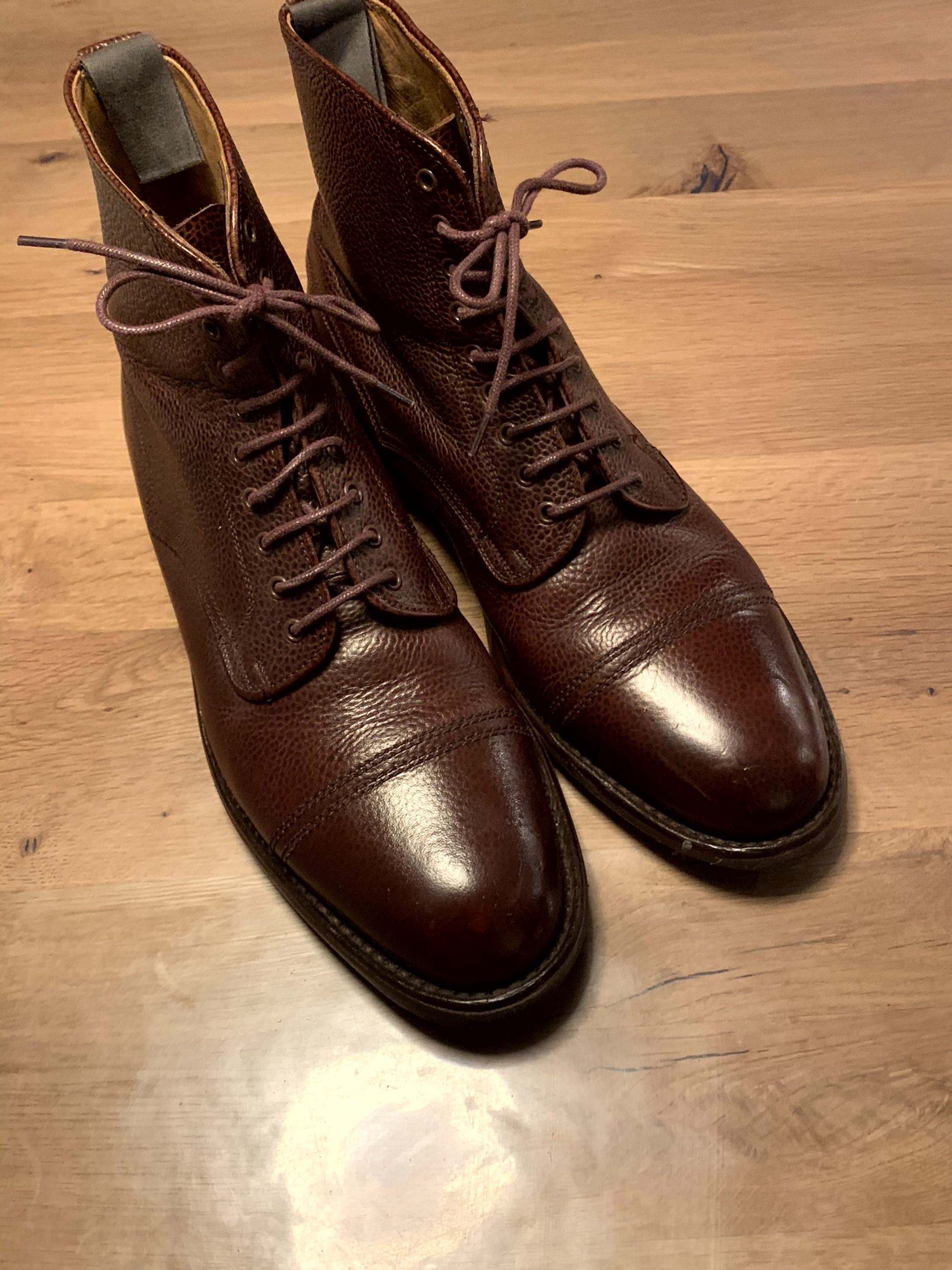 75F donc un peu petite pour moi. Semelle d'origine avec patin. Superbe cuir bookbindé. Légère décoloration sur le captoe de la chaussure droite. Lacets à changer