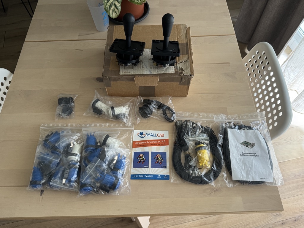 En faisant du rangement dans mes affaires j'ai retrouvé un carton avec tout un set de boutons/switchs/joysticks et câbles que j'avais acheté initialement pour monter une borne d'arcade en bartop.