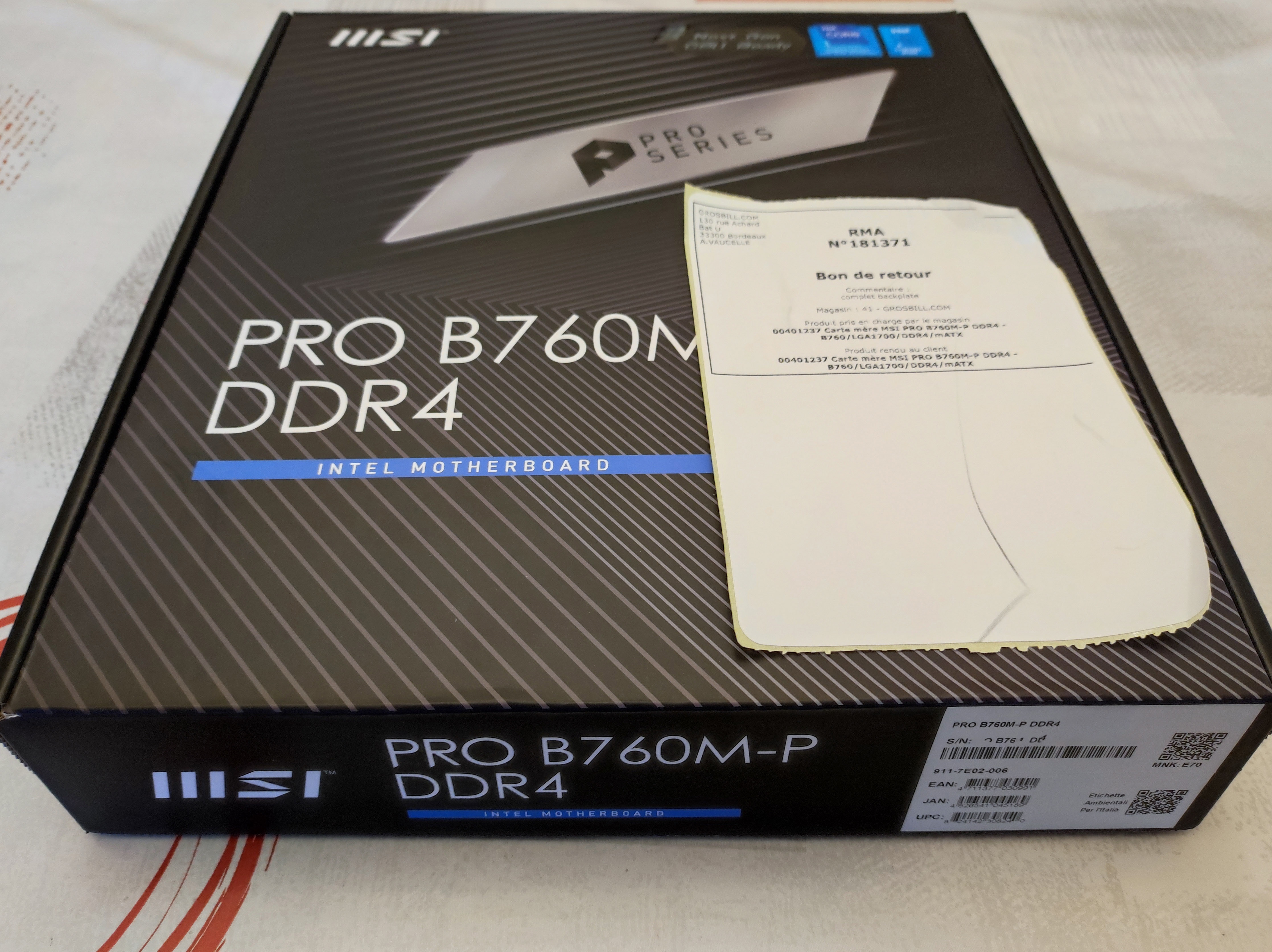 Bonjour, je revends une carte mère MSI PRO B760M-P DDR4totalement neuve. C'est un échange à neuf suite à une panne au déballage. Je n'ai pas attendu les 3/4 semaines nécessaires de RMA et j'en ai racheté une autre. La facture de chez Grosbill est datée du 23/10/2023 et le bordereau de retour en RMA du 27/11/2023. Attention, elle est au format µATX. J'en veux 90€ et je n'offre pas les frais de port (5€ hors assurance) Le main propre est possible sur Amiens ou Doullens dans le 80.