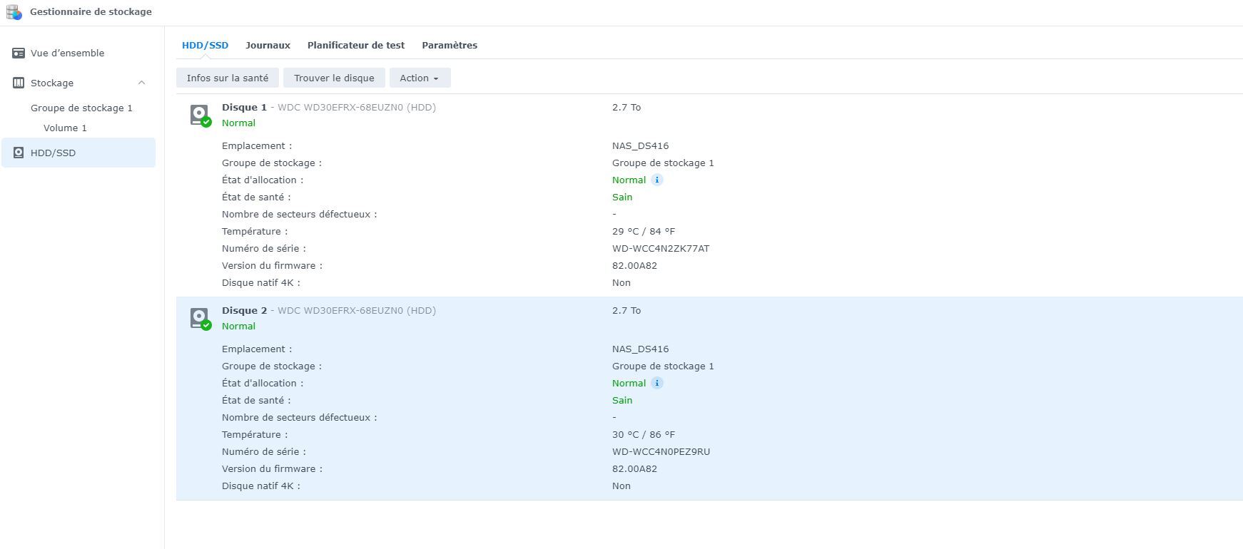 Je vends 2 disques durs spécial NAS de stockage. 3 To pour un disque, le lot de 6 To au total pour les deux disques. Modèle : WD-30EFRX NAS WARE 3.0 RED 80 €uros le lot. Ils sont quasi neuf. Quelques captures :