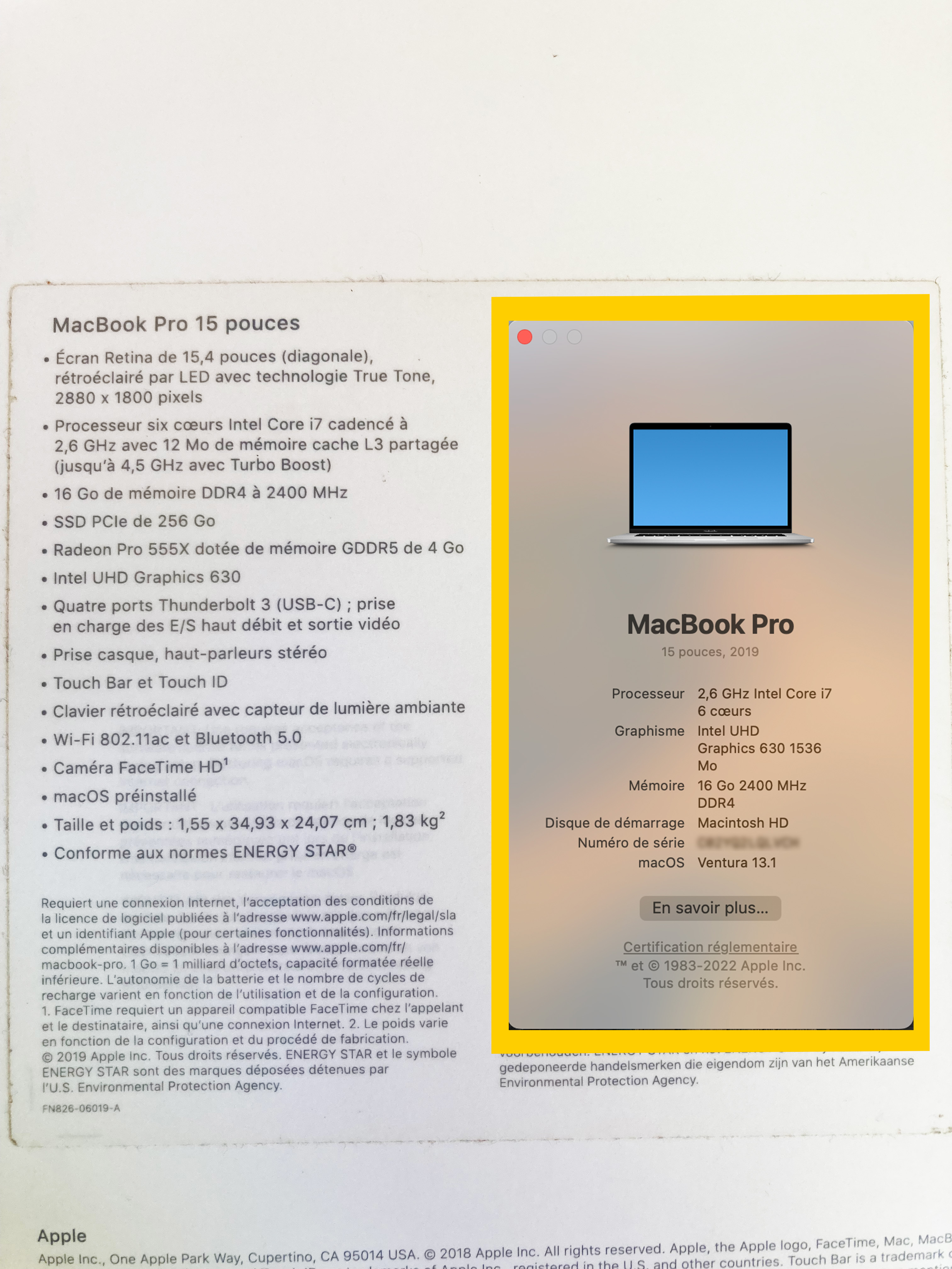 - Écran: Retina 15.4 pouces, true tone, 2880x1800