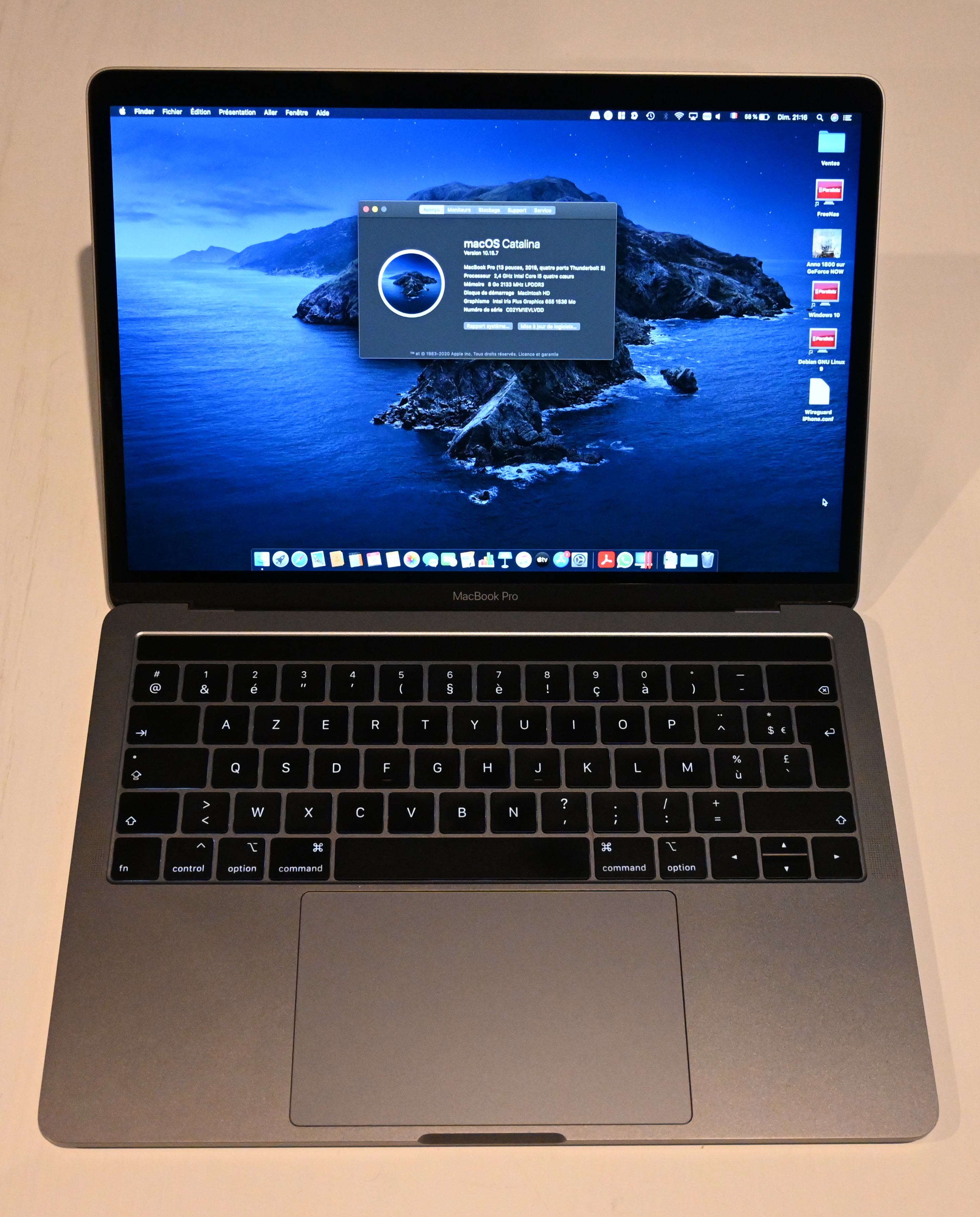 Je vends mon MacBook Pro 13 pouces génération 2019, état comme neuf, le capot a été recouvert d’une protection immixtion bois de Slickwraps après les premières semaine d’utilisation, il est donc comme neuf en dessous. Il sera vendu avec sa boite et son chargeur d’origine (comme neuf aussi, je ne l’utilise quasiment jamais, je charge via une station Thunderbolt 3).