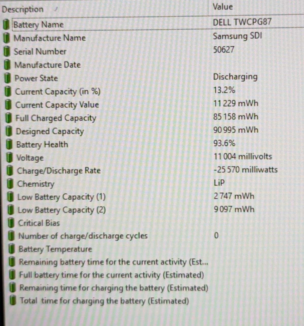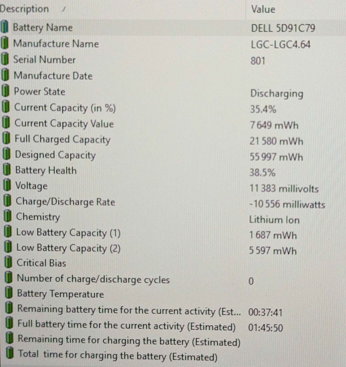 - Batterie 56Wh, santé 38% -> 28Wh restant, environ 2h d'autonomie