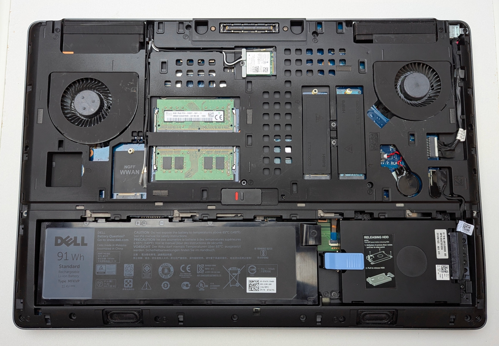Un composant a été remplacé et une piste a été réparé suite à une légère corrosion sur la carte mère. Dans sa précédente vie il a dû recevoir un petit choc coté gauche, le contour en métal est légèrement déformé, c'est très peu visible et pas gênant. C'est une très bonne machine, parmi les dernières workstation Dell à recevoir un port MXM 3.0B (le dernier étant le Precision 7720/génération d'après), la carte graphique est remplaçable par une GTX 1070 MXM sans modification voir par les Quadro RTX 3000/4000/5000 des HP Zbook en modifiant un peu le refroidissement.