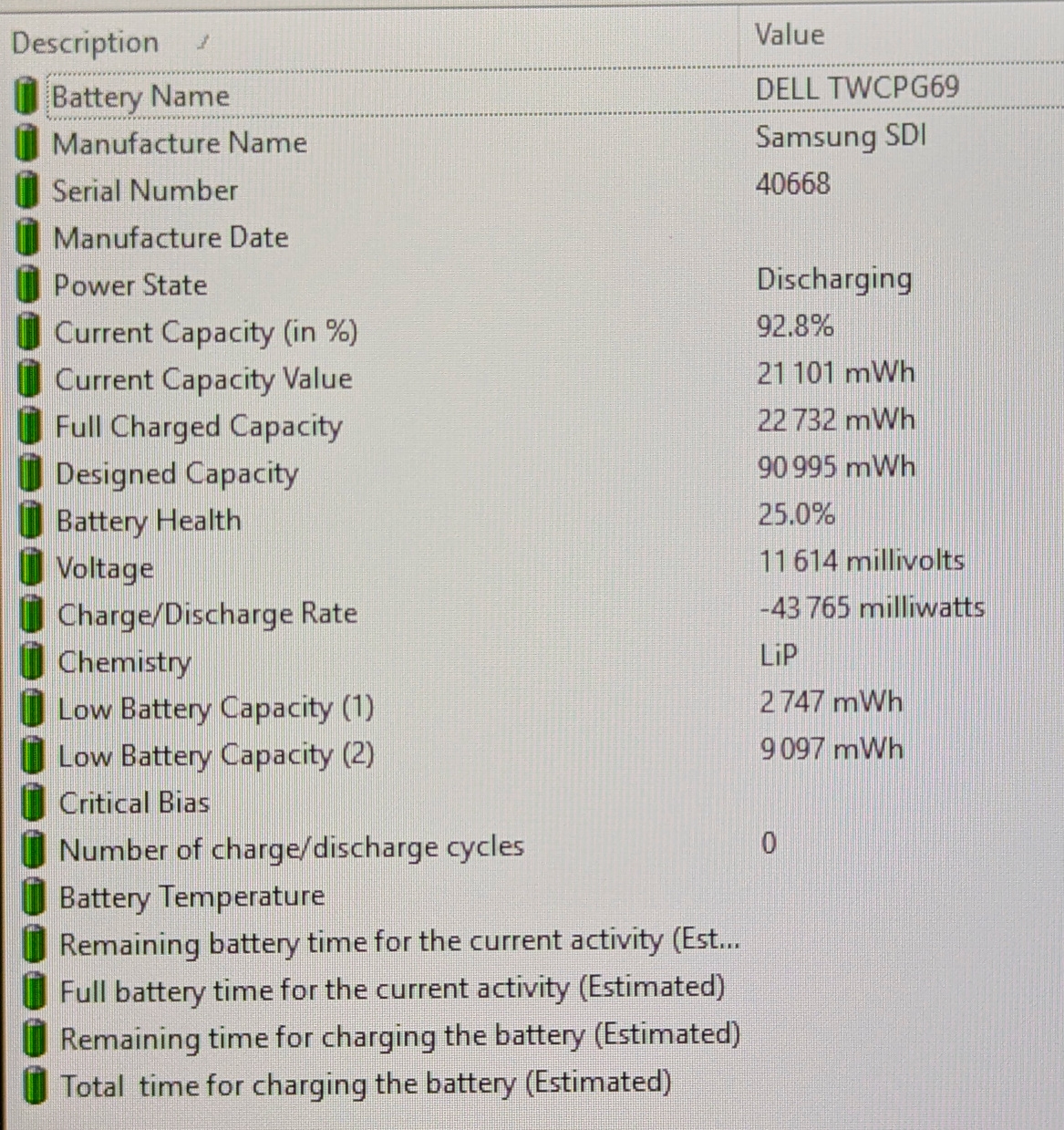 - Batterie 91Wh, santé 25% -> 23Wh restant
