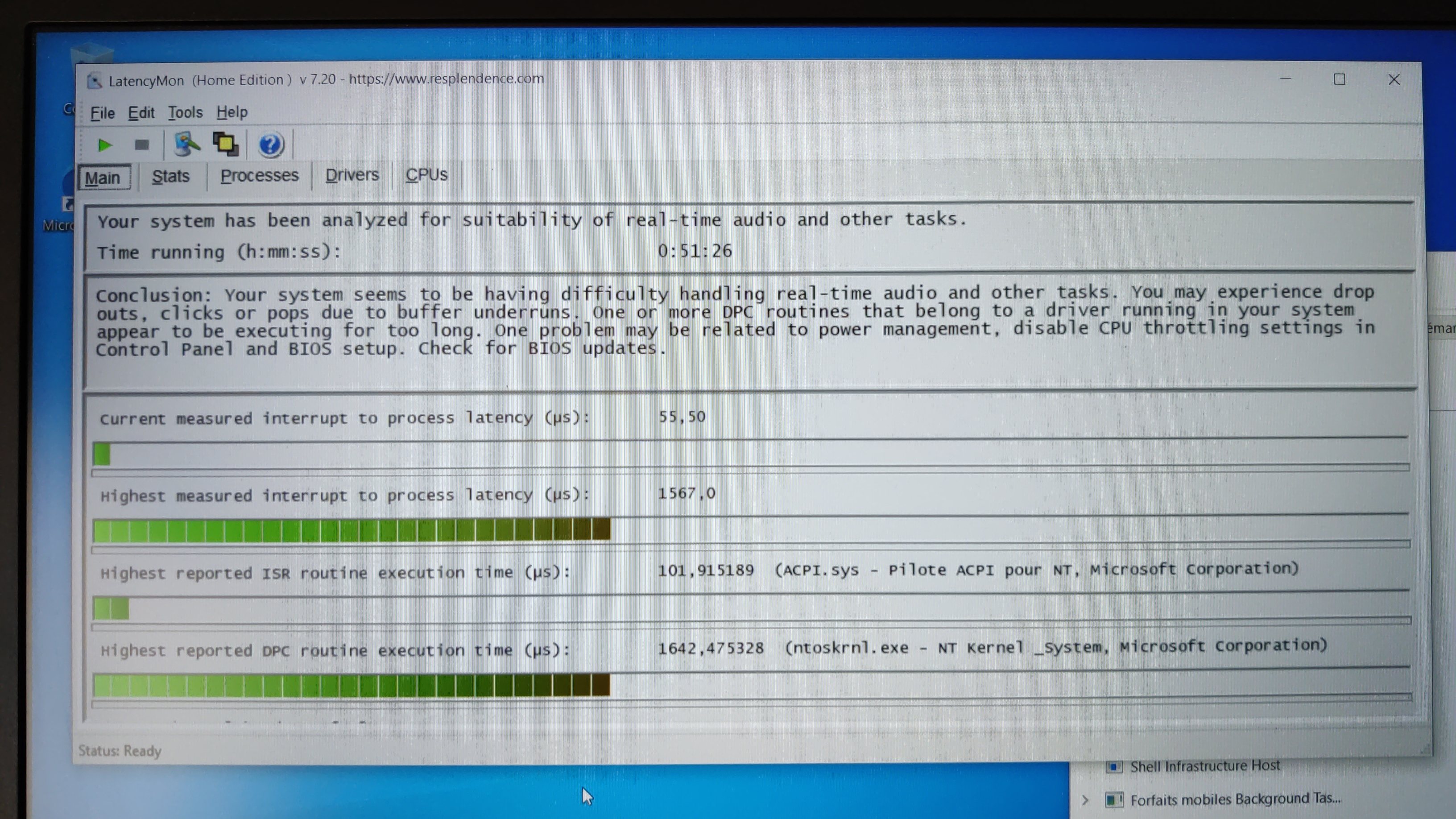 en haut de l'onglet MAIN, il est écrit :"conclusion: your system appears to be suitable for handling real-time audio and other tasks without dropouts."