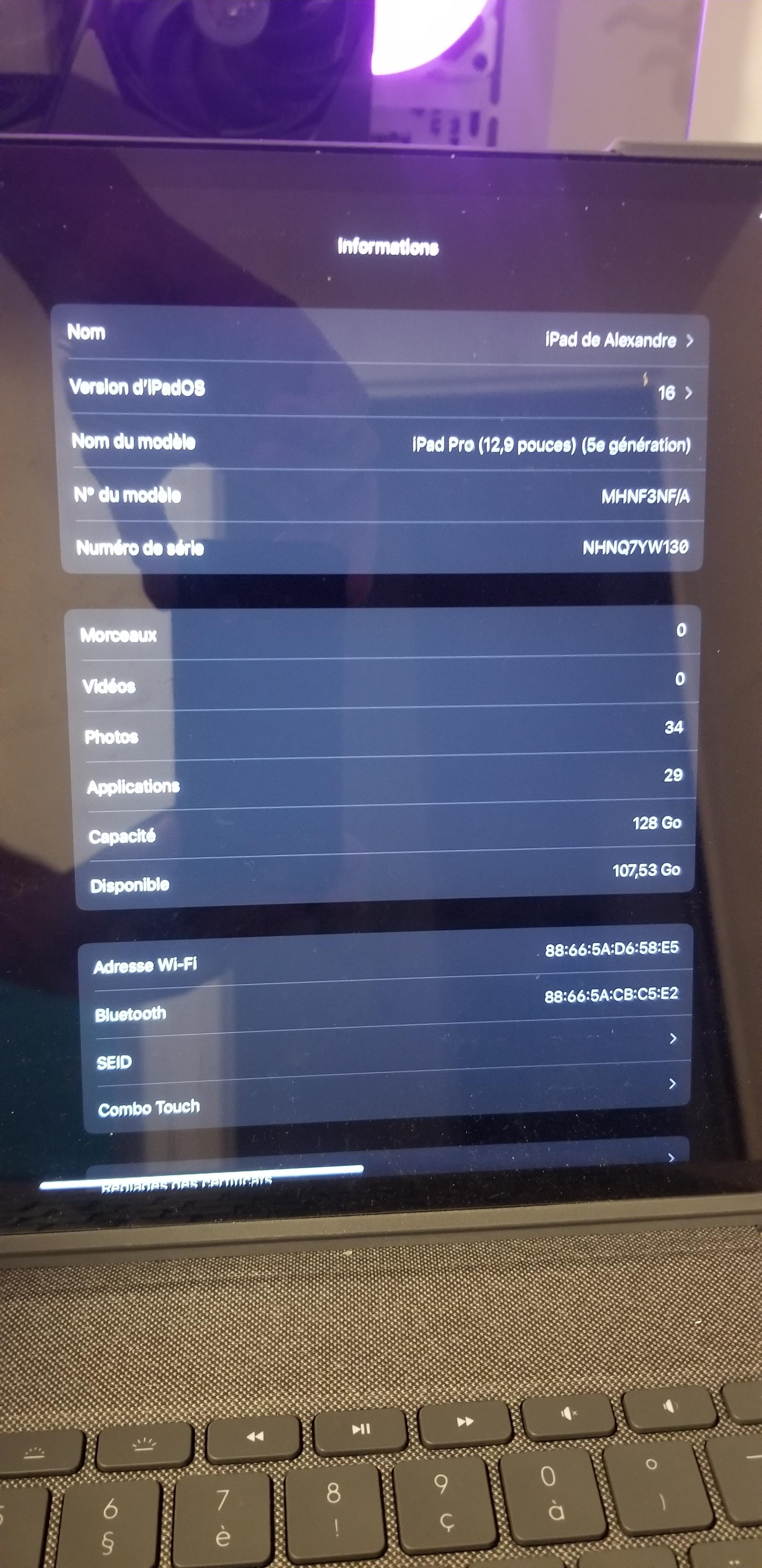 Un iPad Pro M1 12.9" non cellulaire de 128Go acheté en 09/21 (facture dispo).