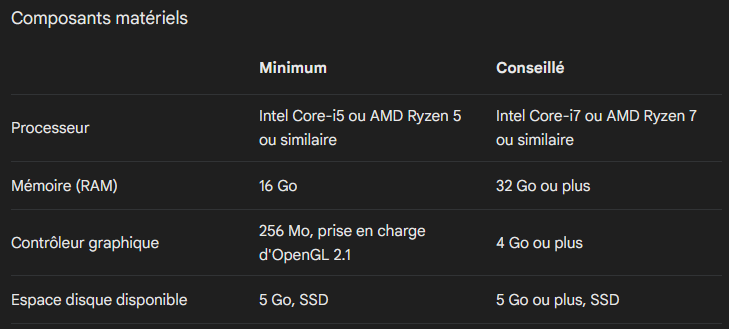 Meme si les exigences materielles sont faibles pour la carte graphique, ils recommandent 32Go de RAM pour le systeme, combien y a t il de RAM sur ton systeme ?