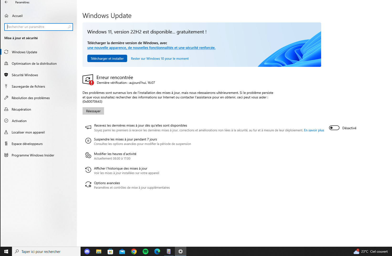 Le problème d'erreur de mise à jour Windows, si tu l'as depuis janvier, presque tout le monde l'a sous Windows 10 : regardes si c'est la KB5034441. Windows essaye de patcher une vulnérabilité de winRE dans la partition de récupération mais pour réussir, il lui faut 250Mo de libre dans celle-ci. Or avec sa taille par défaut de 549Mo, ces 250Mo libre n'y sont pas.