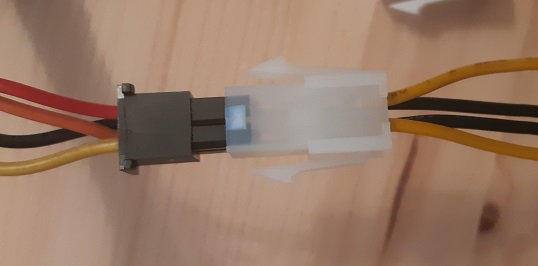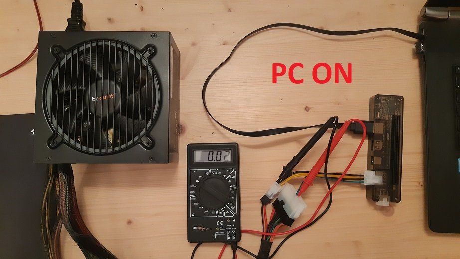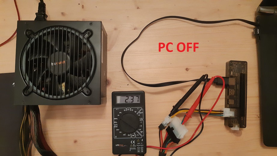 Il faudrait faire le même exercice (pc allumé et pc éteint) entre un fil jaune et un fil noir. La tension devrait être de 0V pc éteint et 12V pc allumé.