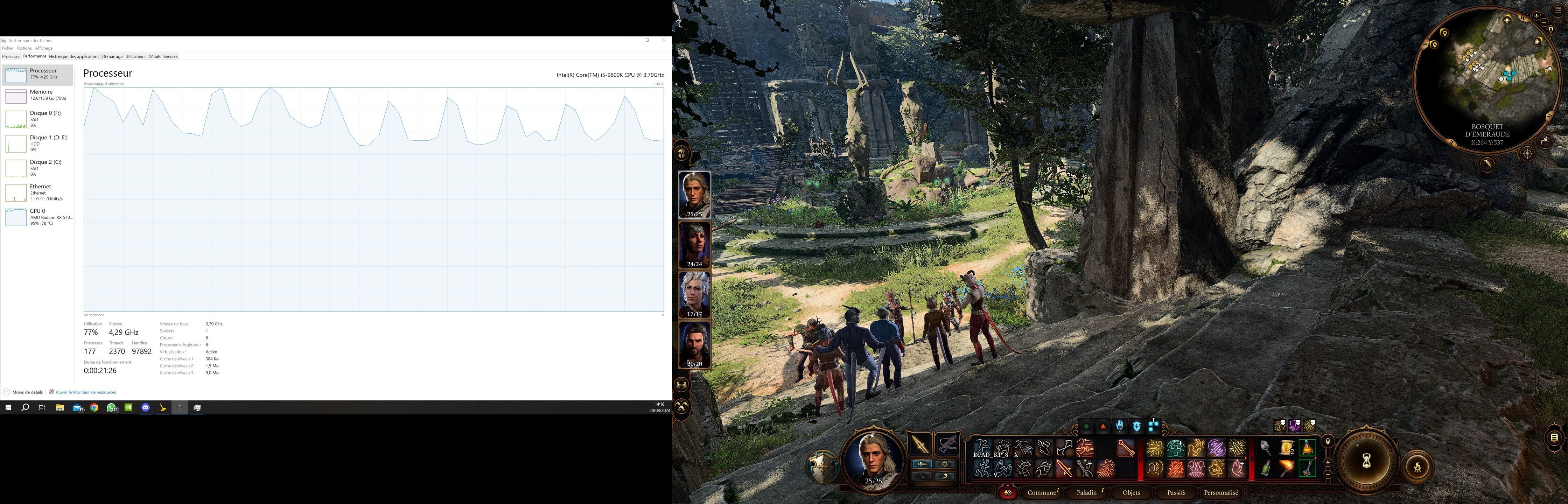 apres le monitoring via gestionnaire de tache c'est pas ce qu'il y a de plus précis. baldur gate 3 dans les zones ouvertes semble a priori assez gourmand en cpu. jouer en ayant préalablement fermé chrome serait un bon début... je remarque également sur son premier screen que la carte graphique est a 78°C, si ce n'est pas le hotspot ca commence a faire chaud !!!