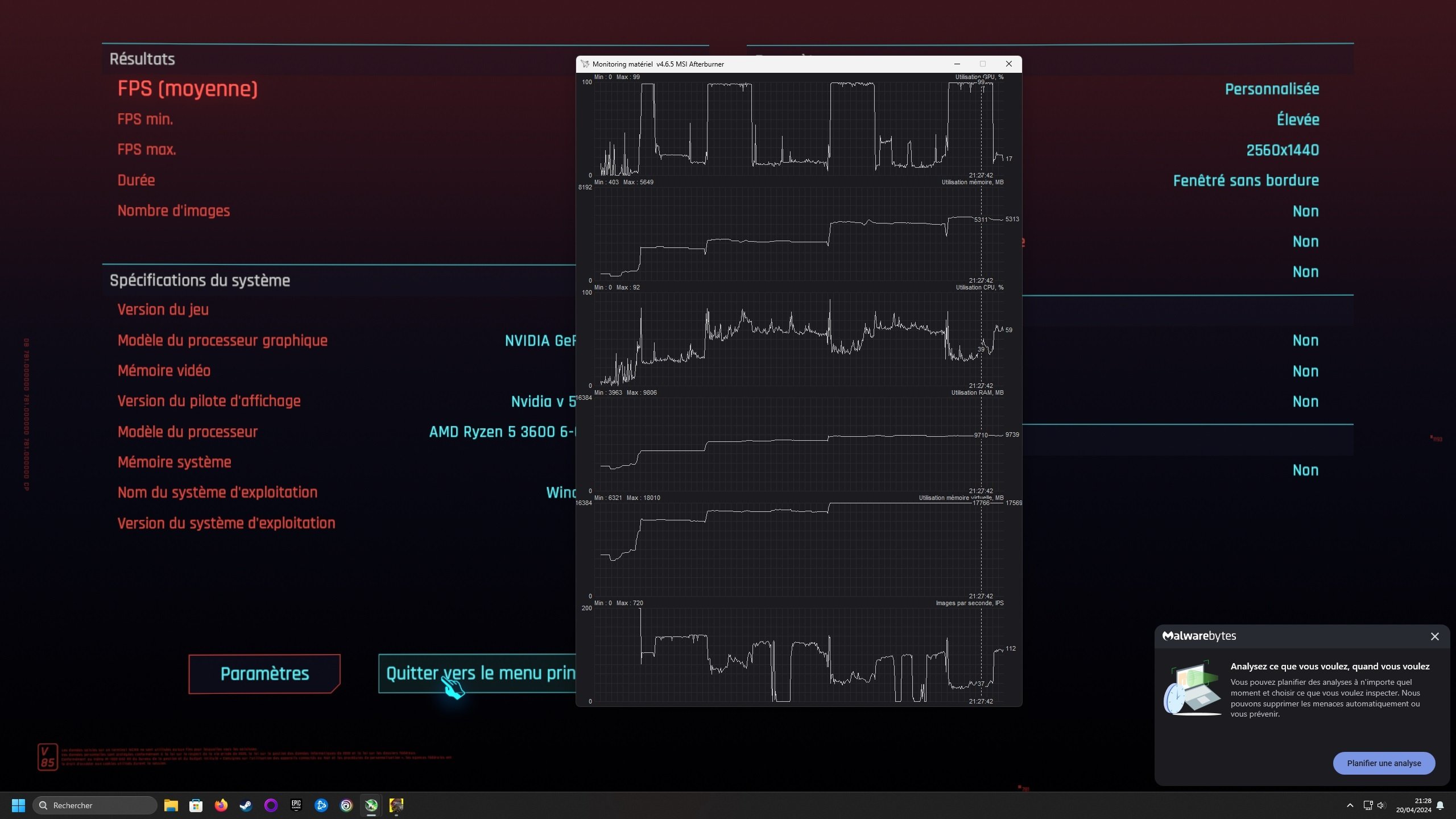 Ci-dessous courbe pour Cyberpunk 2077 en 1440P Élevé avec FSR 2.1 ON