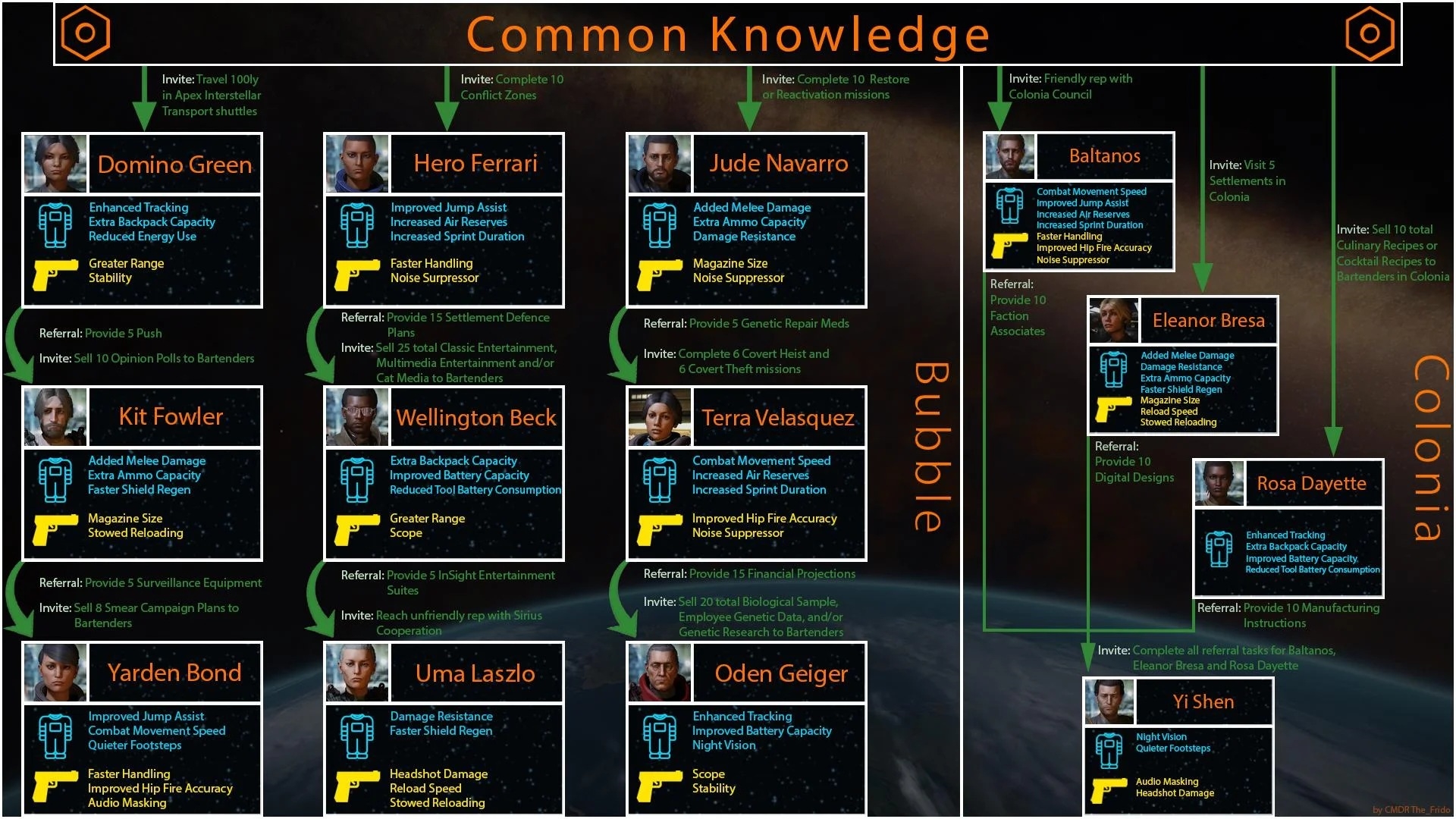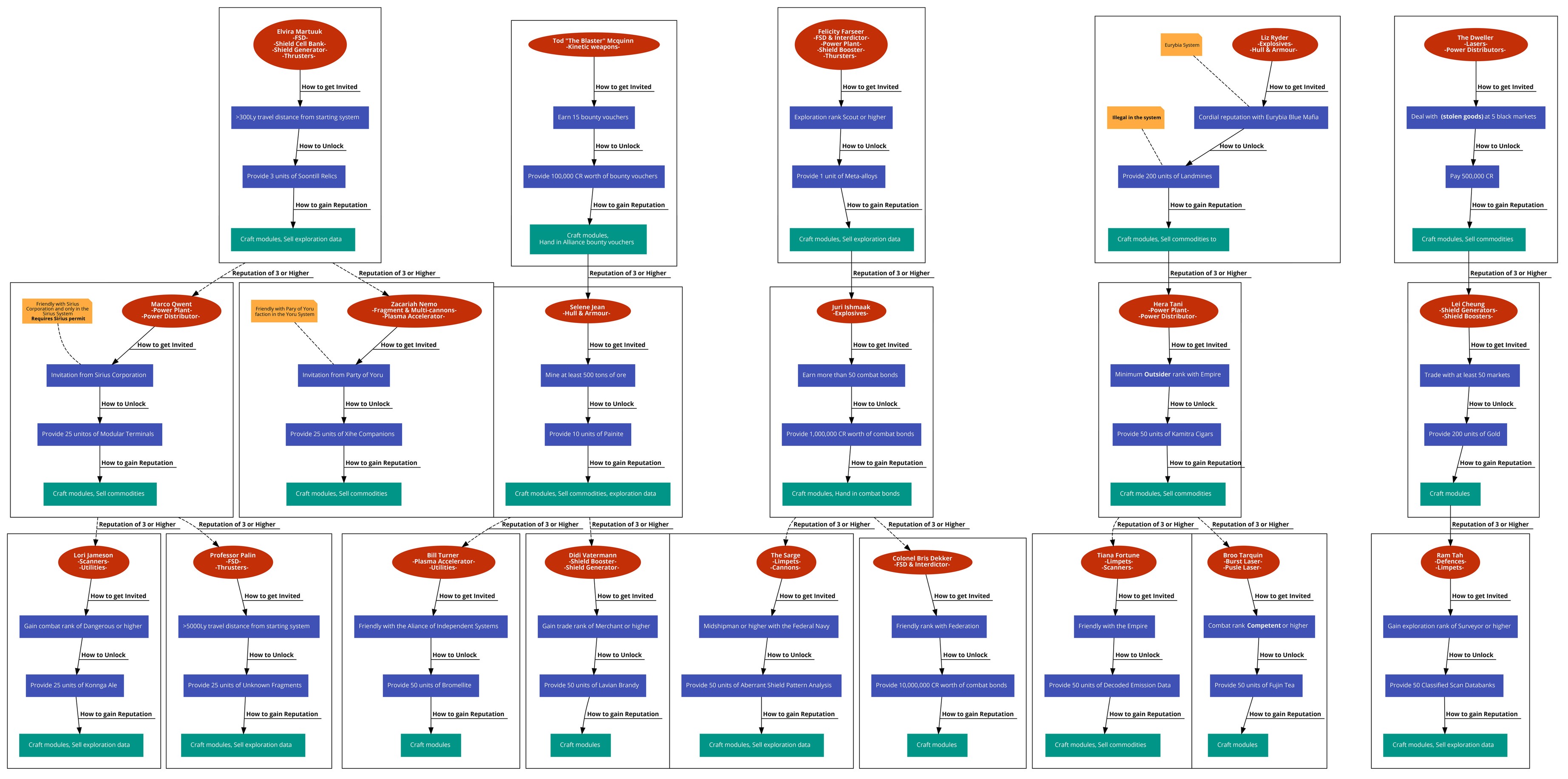 Les ingénieurs ne vous sont pas accessibles de base. Vous devrez d'abord les connaitre, cinq le sont sans pré-requis. Les autres vous seront révélés par d'autres ingénieurs quand vous aurez une bonne réputation auprès d'eux (niveau 3 1/3). Une fois l'ingénieur connu, vous devez atteindre un pré-requis d'invitation, atteint par diverses activités en jeu (exploration, combat, commerce, réputation, etc...). Une fois l'invitation obtenue, il vous reste à remplir une dernière condition pour débloquer l’accès à l’ingénieur, ça peut être des marchandises, des primes ou des données.