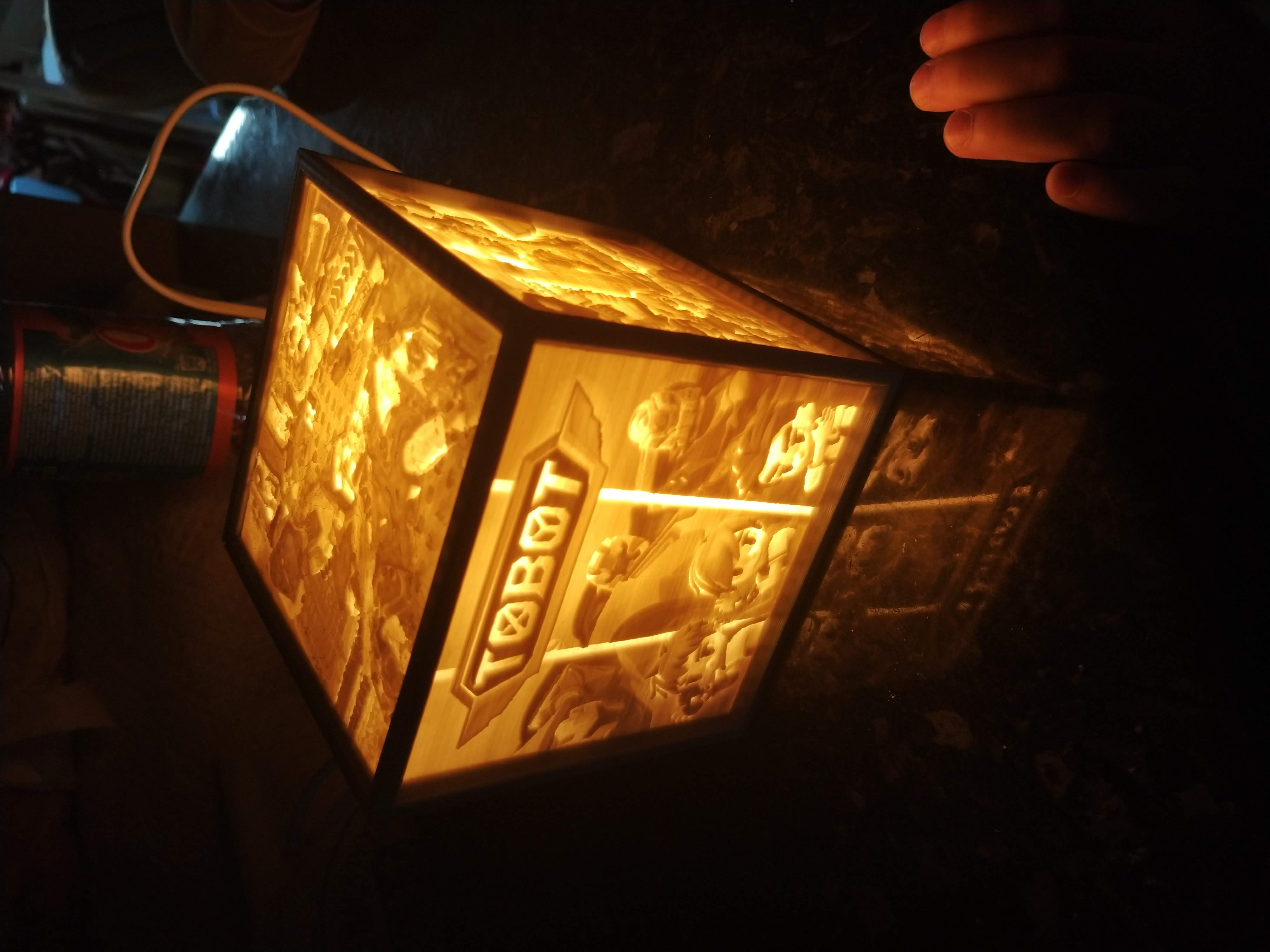 Et voila ma dernière création, pour mon petit gars, fan de la licence TOBOT (anime sur les robots). Lampe de chevet lithophane.
